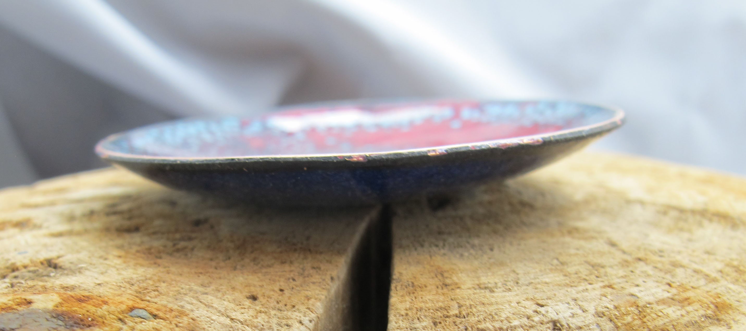 Perfect for your entryway table or next to a sink, this stylish little trinket bowl can hold rings or change or keys. and add an eclectic bit of color to your home. There are so many things you can do with these tiny bowls including votive candles, soaps, small jewelry such as earrings, etc. Handmade, this little copper bowl has been kiln fired about 6 times with multiple vitreous enamels to create a deep, mixed color affect. The main colors are Red, and an Aqua Sea Green . The back is enameled with blue and clear showing some darkened metal. It is a bit less than two and a half inches in diameter. Handmade enamel pieces many times will show some stilt firing marks on the back, and you can find those on this piece. I charge actual shipping so the shipping of $4 will be added to the cost of your order. Ships within 3 days. Thank you for shopping handmade!